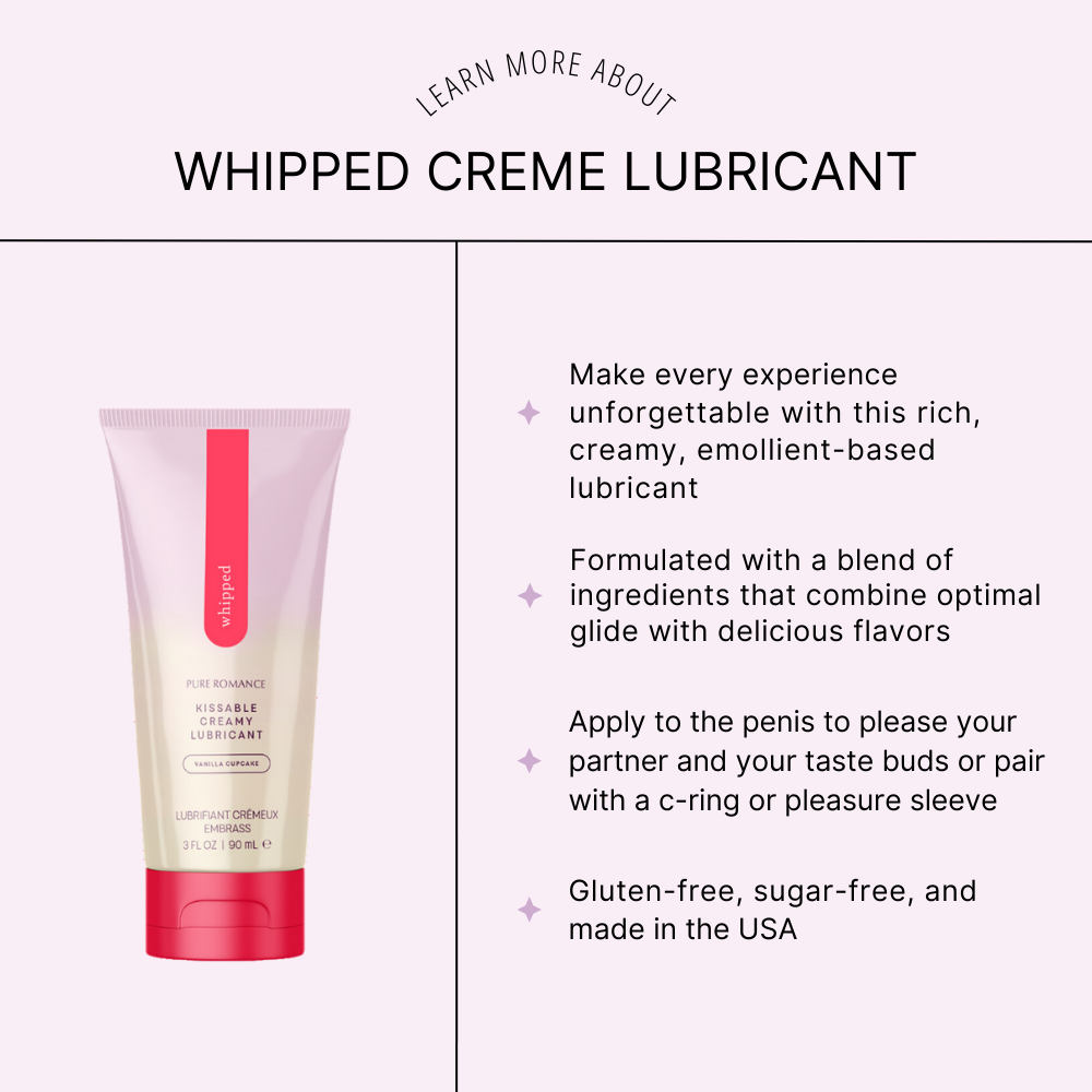 This rich, emollient-based lubricant makes every experience unforgettable no matter what's on the agenda. Whipped is made with a blend of ingredients that combine optimal glide with delicious flavors. Apply to the penis to please your partner and your taste buds or pair with a c-ring or pleasure sleeve.